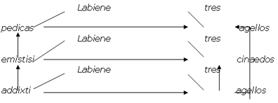 Mit addixti eröffnet Martial das Tristichon. Durch das jeweils am Zeilenanfang stehende Verb setzt er ein Signal: Handlungen bestimmen weitgehend das Epigramm. Das erhabene Metrum des Molossers stellt fest, ist also konstatierend und zugleich weiter schreitend. Labiene(27) schließt eng an addixti an. Das Du konkretisiert sich im Namen, der sexuell konnotiert ist.(28)