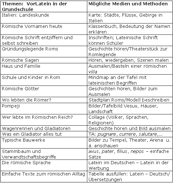 Die Inhalte des Lateinunterrichtes im Primarbereich müssen sich an der Lebenswelt der Zehnjährigen orientieren, an ihren Interessen und Fähigkeiten. Hier wird jeder Kollege, der mit Grundschülern Unterricht versucht, erstaunt sein, wie langsam und noch unvollständig diese jungen Menschen grundlegende Kulturtechniken beherrschen. Bis 20 Schüler durchaus intelligente Kinder - drei einfache Sätze von der Tafel abgeschrieben haben, kann es schon einmal 25 Minuten dauern. Natürlich sind einige sehr schnell fertig, aber auch die anderen sollen mitkommen. Malen und Basteln kommt immer gut an, sollte jedoch der Themenvielfalt wegen nicht übertrieben werden.
