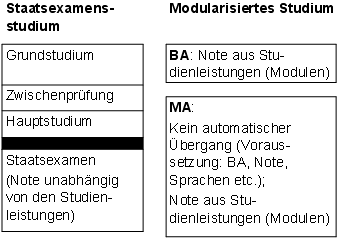 Um klar zu machen, worin die Unterschiede zwischen den traditionellen Staatsexamensstudiengängen und den neuen modularisierten (dazu unten) Formen liegen, diene folgende Graphik: Es wird zunächst die Crux des alten Studiengangs deutlich, der ein systemnotwendiges Auseinanderfallen von Prüfung und vorherigem Studium mit sich brachte. Im modularisierten Studium dagegen gehen die Studienleistungen von Anfang an in das Endergebnis ein, eine eventuelle Abschlussprüfung spielt nur noch eine allenfalls untergeordnete Rolle (es sei angemerkt, dass derzeit im Land Berlin noch nicht klar ist, ob und wenn ja, wie, Leistungen aus dem BA- und MA-Studium in eine staatsexamensadäquate Endnote eingehen). Waren früher Grund- und Hauptstudium nur durch den rite de passage der Zwischenprüfung geschieden, so sind es jetzt zwei getrennte Studienphasen mit eigenständigen akademischen, berufsqualifizierenden Abschlüssen. Es gibt keinen automatischen Übergang mehr, vielmehr können (und sollen) für den MA eigene Zugangsvoraussetzungen definiert werden (etwa eine bestimmte Mindestnote aus dem BA, Sprachkenntnisse [Graecum!] o. dgl.):