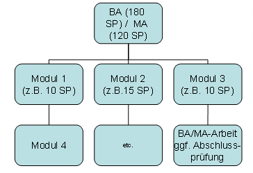 Ein Modul ist eine Lehreinheit, die fachlich sinnvoll aus mehreren Lehrveranstaltungen zusammengesetzt ist. Jedes Modul wird entsprechend dem mit der Teilnahme verbundenen Zeitaufwand (Anwesenheit in den Lehrveranstaltungen, Vor- und Nachbereitung, Prüfung) mit Punkten gewichtet. Die Studien- bzw. Leistungspunkte (1 Punkt entspricht 30 Arbeitsstunden, also etwa der reinen Teilnahme an einer zweistündigen Lehrveranstaltung ohne Zusatzleistungen) addieren sich bei einem sechssemestrigen BA-Studium zur Gesamtsumme 180, bei einem viersemestrigen MA zu 120.