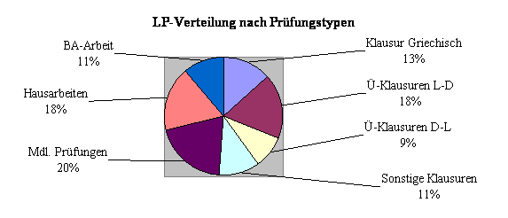 Bei der Erstellung der neuen Studienordnung kam es darauf an, das, was ein durchschnittlich fleißiger Student in sechs Semestern Studium bisher lernen sollte und konnte, nach den neuen Richtlinien abzubilden. Die Leistungspunkte (LP) sind nicht nur ein Indikator für den Arbeitsaufwand, den ein Student für das jeweilige Modul leisten muss, sondern auch eine Verhältniszahl für die Gewichtung dieses Moduls in der Abschlussnote. Jede Modulnote geht in die Abschlussnote mit ein. Das alte System der Abschlussprüfungen wurde also durch eines mit studienbegleitenden Prüfungen (den sog. Modulabschlussprüfungen, MAPs) ersetzt. Daraus folgt, dass das, womit der Studierende während seines Studiums die meiste Zeit verbringt, auch entsprechend in der Note gewichtet wird. Nach dem neuen System muss das, was geprüft wird, auch in der Beschreibung der Lehrveranstaltung mit enthalten sein. Hier wurde sowohl hinsichtlich der Studieninhalte wie der Prüfungsformen eine gute Ausgewogenheit erzielt, wie die folgenden Grafiken zeigen(2):