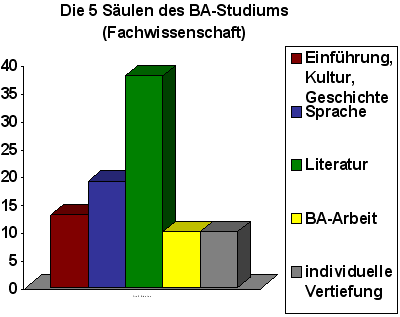 Dieses Schema macht vor allem die Arbeitsverteilung auf die sechs Semester deutlich: Auf die Phase des Basis-Studiums, in der die methodischen, sprachlichen und literaturwissenschaftlichen Grundlagen gelegt werden, folgt die Vertiefung auf allen drei Feldern. Das sechste Semester muss (derzeit) vor allem für die Anfertigung der Bachelor-Arbeit freigehalten werden, doch sind hier demnächst Änderungen zu erwarten, die die Möglichkeit zu weiterer Entzerrung bieten.