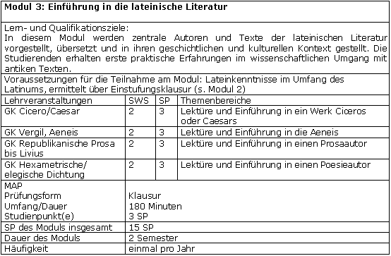 - Im dritten Modul (Methoden und Grundlagen der Lateinischen Philologie) erhält man einen ersten Überblick über die Lateinische Literaturgeschichte sowie verschiedene Teilgebiete des Faches wie Metrik, Textkritik und Rhetorik.