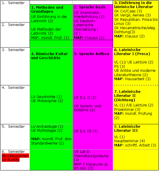 In den ersten vier Semestern hat man genug Erfahrung im Umgang mit der lateinischen Sprache anhand der klassischen Autoren gesammelt, so dass der Schwerpunkt am Ende des Studiums auf der Vor- und Nachklassik liegt. Das Pensum der zu besuchenden Lehrveranstaltungen verringert sich gegen Ende, damit genug Zeit für das Abfassen der BA-Arbeit bleibt. Das Thema dieser Arbeit, die ca. 30 Seiten umfassen soll, ist wahlfrei.