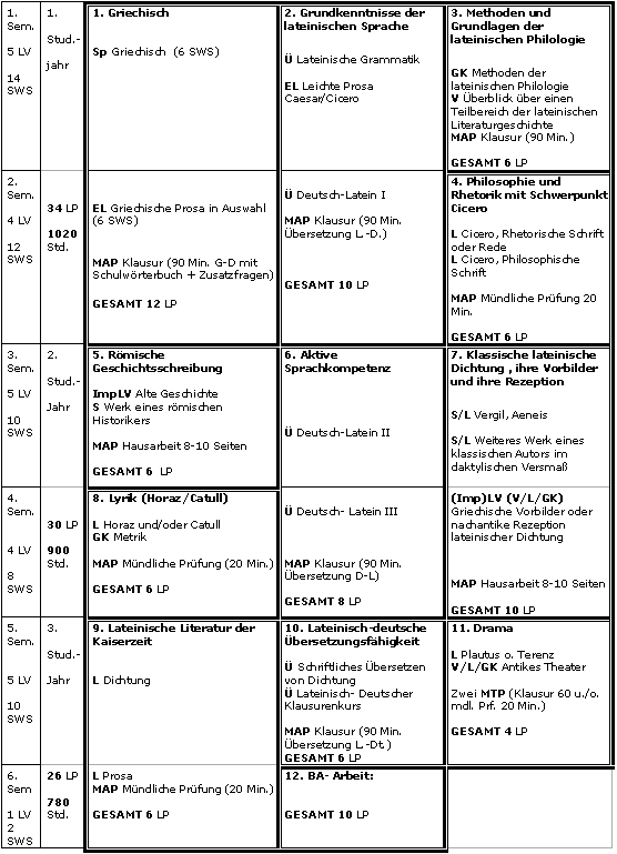 Ein Blick auf den Studienverlaufsplan zeigt, dass insbesondere die später für die Schule relevanten Bereiche der lateinischen Literatur abgedeckt sind. Darüber hinaus bestehen Kooperationen mit den Fächern Alte Geschichte und Griechisch. Lehrveranstaltungen dieser beiden Fächer sind Teil der Module 5 (Römische Geschichtsschreibung) und optional 7 (Klassische lateinische Dichtung). Als Leistungsnachweis in diesen beiden Modulen dient eine 8-10-seitige Hausarbeit, die auf die Abfassung der BA-Arbeit am Ende des Studiums vorbereiten soll. Nach wie vor wird große Bedeutung auf den Erwerb aktiver Sprachkompetenz gelegt, und zwar in den deutsch-lateinischen Übungen.