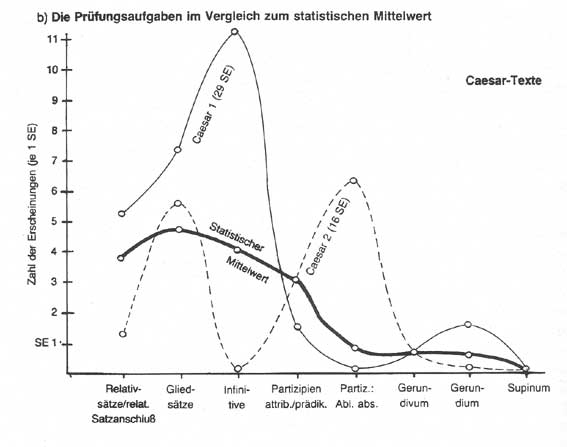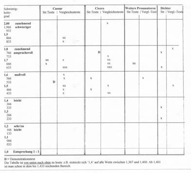 3. Es mag noch interessieren, ob die Beurteilung des Caesar 1' durch F.Maier durch Anwendung der hier vorgestellten Methode bestätigt wird. Sie wird bestätigt: Der nach obiger Methode festgestellte Schwierigkeitsgrad ist 2,03; von einer Verwendung des Textes als Prüfungsaufgabe muss abgeraten werden. (9)
