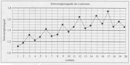 Man erkennt an der Kurve, dass der Schwierigkeitsgrad der 20 Lektionen, wie die Sache es erfordert, tief ansetzt, bald aber stetig ansteigt und in den Lektionen 12, 15, 17 in den anspruchvolleren Bereich hineinreicht, um danach wieder in den Normalbereich abzusinken. Im Besitz solcher Informationen wird der Lehrer die Vorbereitungs- und Übungsnotwendigkeiten für eine Lektion sicherer abschätzen können, als wenn er von den vorkommenden Schwierigkeiten überrascht wird.