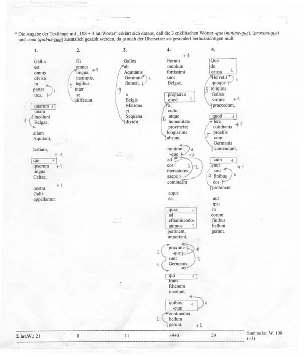 Ich schreibe den zu analysierenden Text grundsätzlich in senkrechten Kolonnen satzweise auf, möglichst mit Leerzeilen zwischen den Kola. Hierbei betrachte ich Enklitika wie -que' oder -cum' (z.B. in quibus-cum ) als eigenständige Wörter, da sie ja auch gesondert übersetzt werden müssen. Sodann zähle ich die Wörter satzweise und stelle die Textlänge fest. Die ungewohnte Art des Aufschreibens, die den Text aus dem Prokrustesbett des Satzspiegels befreit, zwingt dazu, jedes Wort wirklich in die Hand zu nehmen'. Dabei wird der Satzleib' visualisiert. Zudem entsteht der für das Eintragen von Analyse-Beobachtungen benötigte Platz. [Es käme auf einen Versuch an, ob Schüler sich mit senkrecht angeordneten Prüfungstexten nicht leichter täten.]