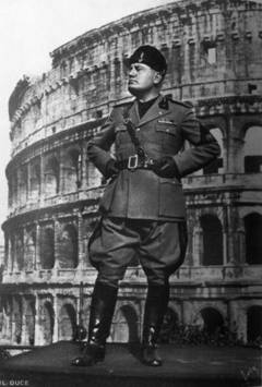 Eine propagandistische Fotomontage, die den etwas aufgeblasen redenden Mussolini vor einem Ausschnitt des Colosseums in Tiefperspektive zeigt, verdeutlicht, wie sehr sich das faschistische Regime selbst als Rezeption von römischer Antike darstellte.